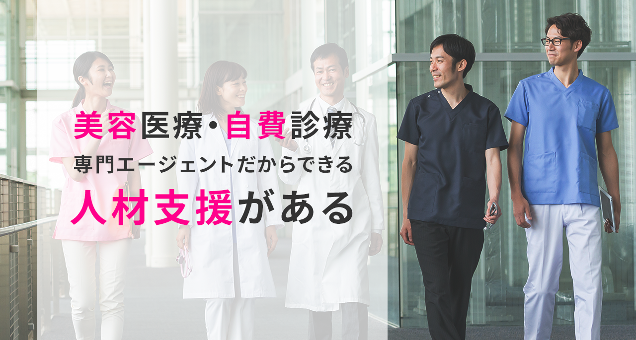10年以上にわたり美容医療・自費診療専門の人材エージェントとして培ったノウハウと、ネットワークを通じて、医療業界においても新しい働き方を提案・拡大し、一人でも多くの医療従事者が笑顔で働ける環境の創造を目指します。質の高いマッチング・迅速な紹介・高い定着率で評価いただいています。